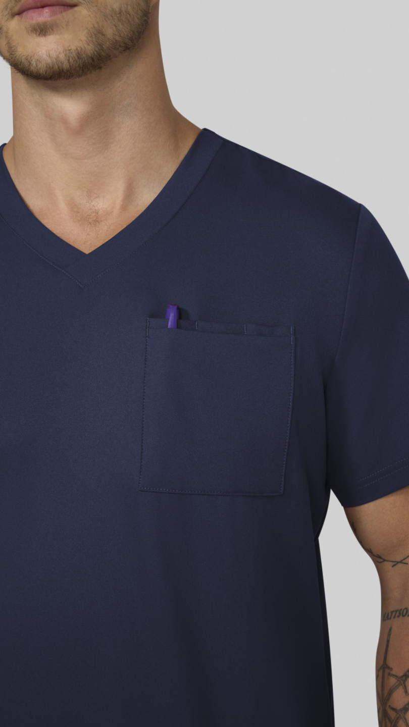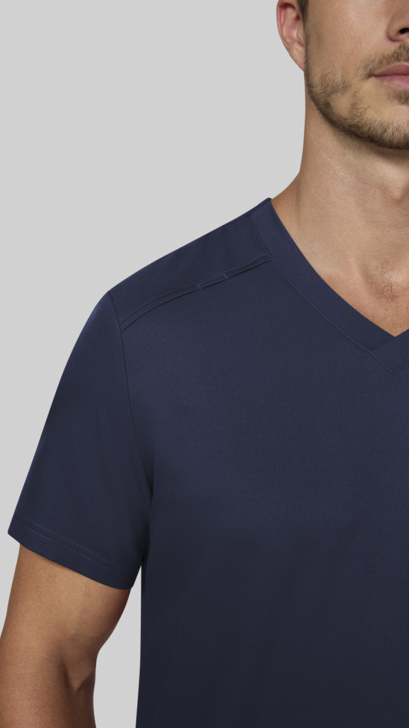 Bluza ima klasičan V-izrez i dva praktična džepa, jedan na prsima i jedan na rukavu, uz dodatne pretince za olovke i petlju za ID karticu.