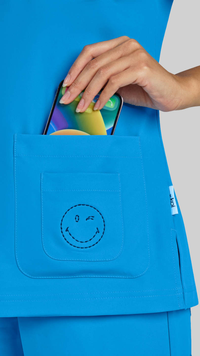 Koi Smiley Blissful medicinska bluza spaja udobnost, funkcionalnost i razigran dizajn. Dio je posebne saradnje brenda koi i SmileyWorld, pa uz praktičnost donosi i detalj koji unosi vedrinu u svaki radni dan.
